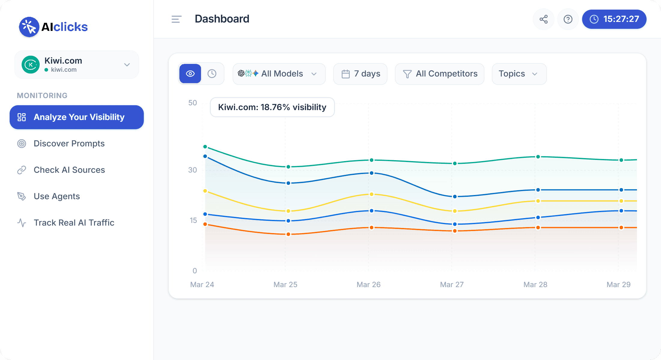 AIclicks watches how often AI chatbots like ChatGPT mention your brand. We show you if your business appears when people ask questions, and help you get mentioned more often in AI answers.