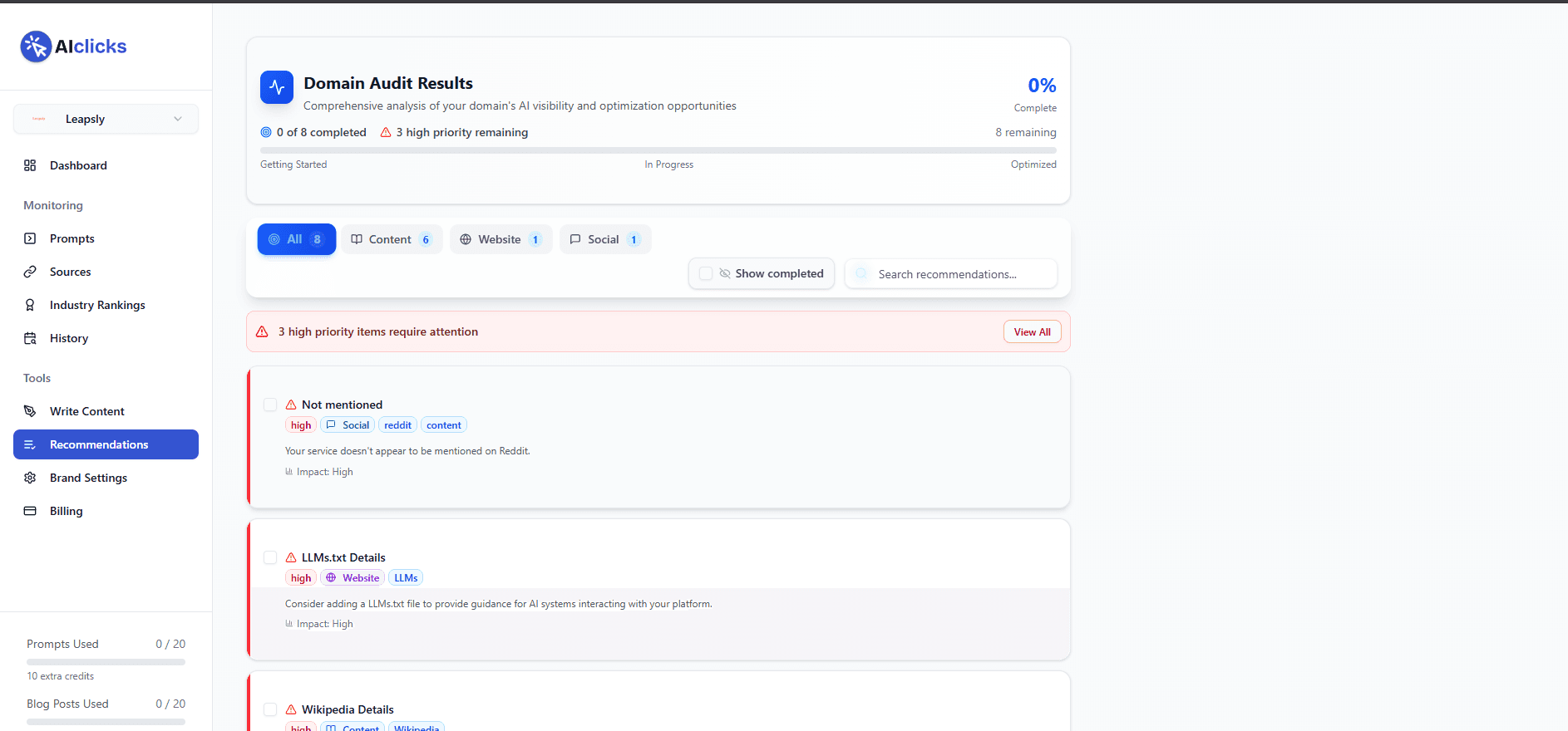 Actionable Recommendations: The platform provides prioritized tasks such as adding an LLMs.txt file to guide AI crawlers, creating a Wikipedia page for brand authority, or targeting content gaps in prompts where visibility is low.