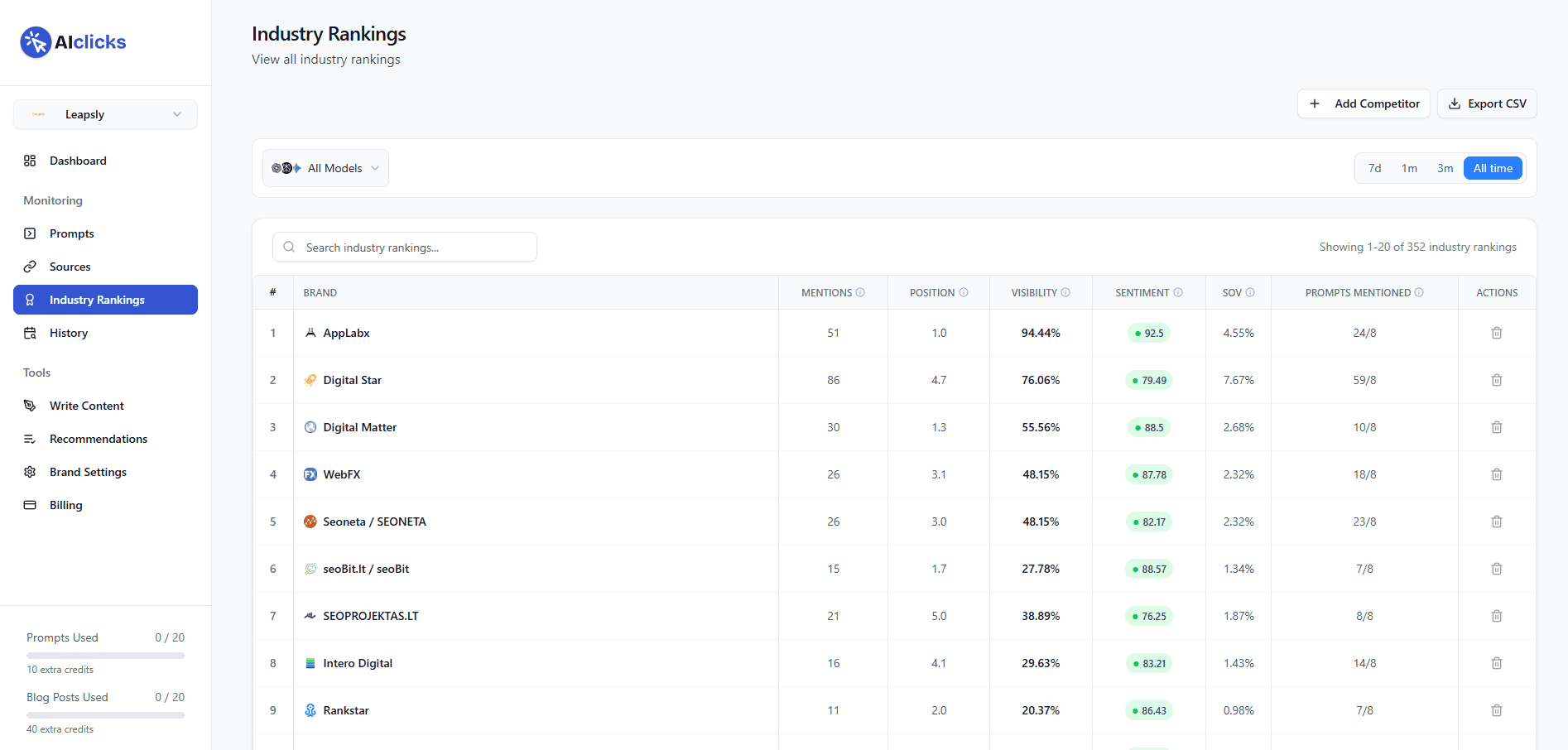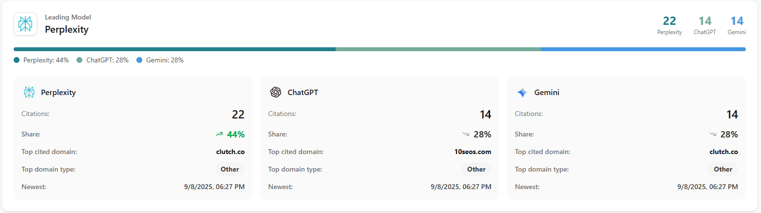 Competitor Benchmarking: A competitor module ranks rivals by how often they appear in AI answers and highlights which domains dominate citations. Benchmarking allows you to calibrate your strategy to overtake competitors.