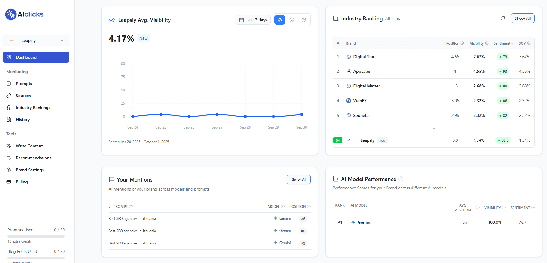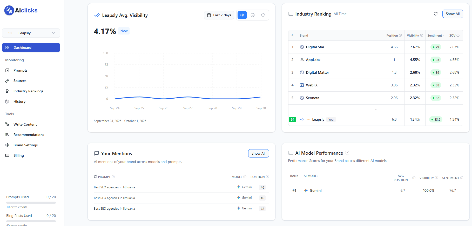 AI Search Visibility Tracking: An interactive dashboard summarizes the total number of prompts tracked, brand mentions, unique citations, visibility rate and changes over time. This helps quantify your AI footprint and prove ROI.