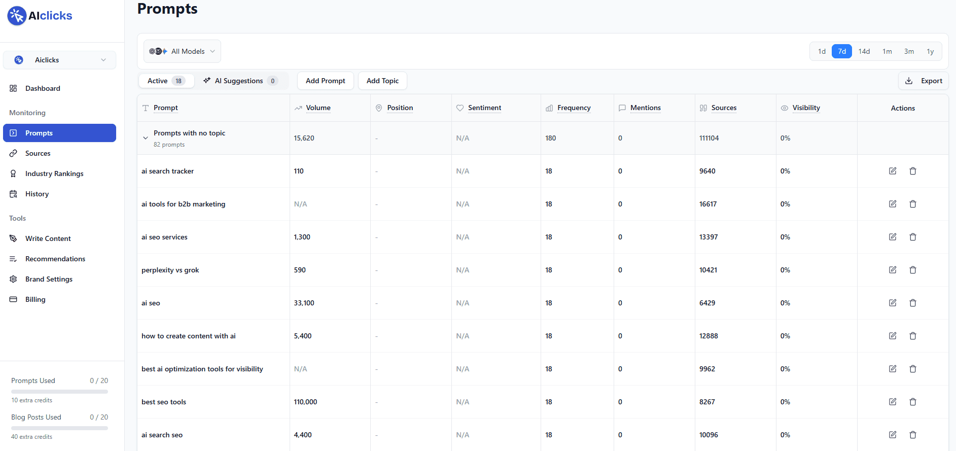 AI search is prompt-driven, which means every query is unique. Identify high-performing prompts that are likely to bring traffic and tailor your content to perform better for these. With AIclicks, you can track which models cite your brand, measuring mentions and visibility rates.