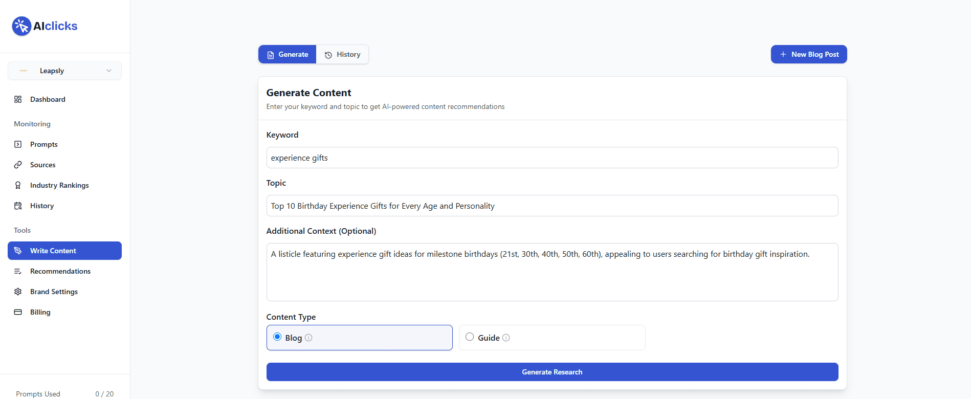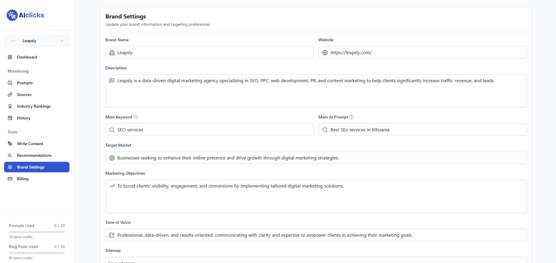 Brand Configuration: You can configure your brand name, primary keyword, target market and tone of voice so the AI‑generated content aligns with your messaging.