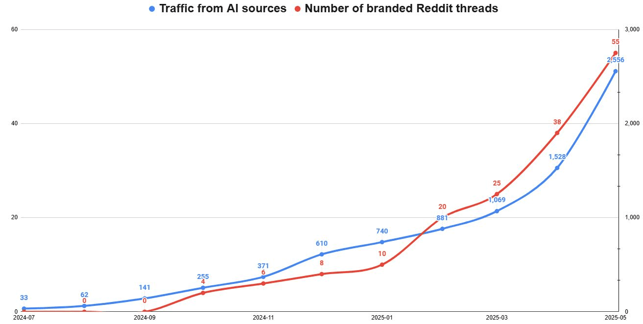 Tip: Reddit is a powerful signal for AI visibility. As shown in the graph, the number of branded threads directly boosts traffic from AI sources. Engaging in forums like Reddit, Quora, and Stack Overflow is a key tactic for increasing citations and visibility.