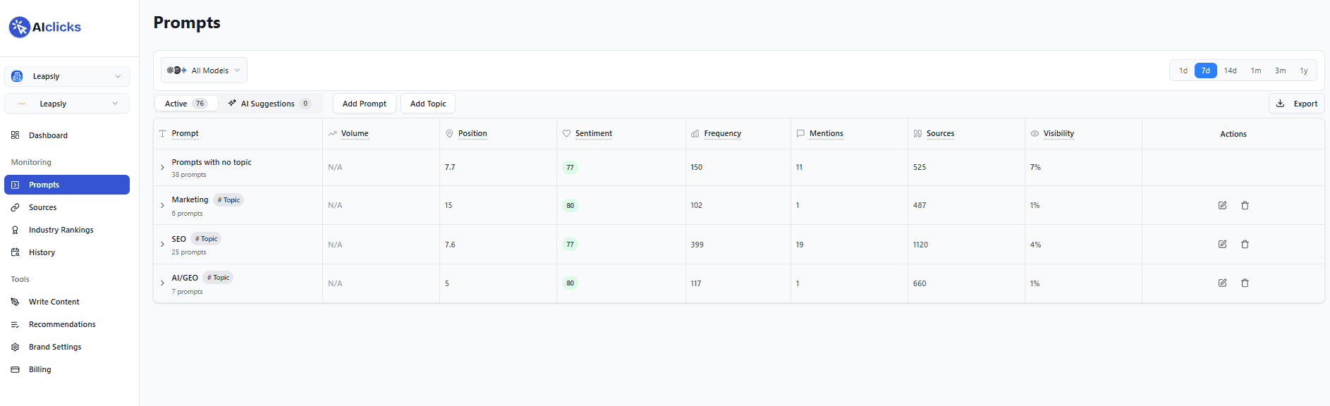 Use an AI visibility dashboard (like ours at aiclicks.io). This gives you a bird’s-eye view: which prompts mention your brand, how many times you’re cited, and which sources AI agents trust most.