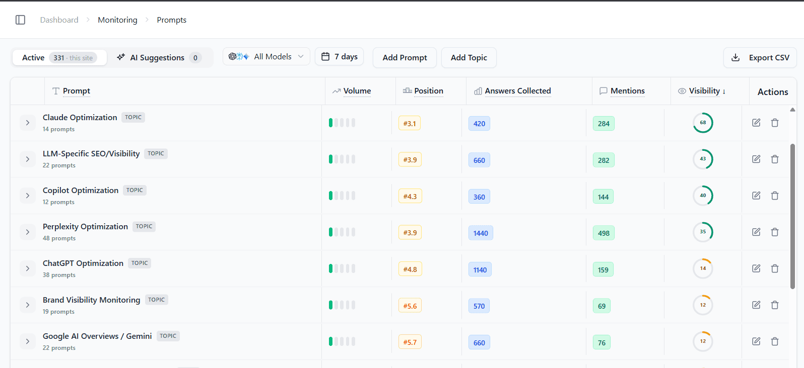 Identify the commercial and high-intent questions users actually ask inside AI tools. Group them into clusters and monitor your visibility across them.