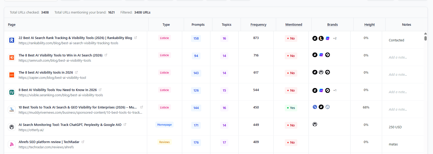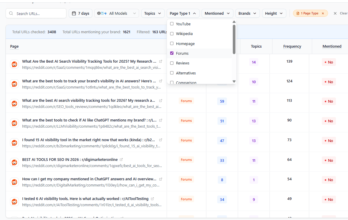Filtering by type → Segment sources into forums (Reddit, Quora), review directories (G2, Trustpilot, Capterra), listicles, or news/media to prioritize where you’re underrepresented.