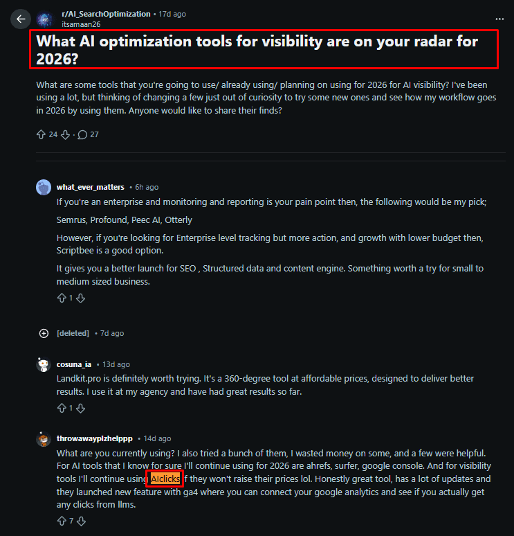 If competitors are repeatedly mentioned in these threads and you are not, that gap can affect how AI tools synthesize recommendations.