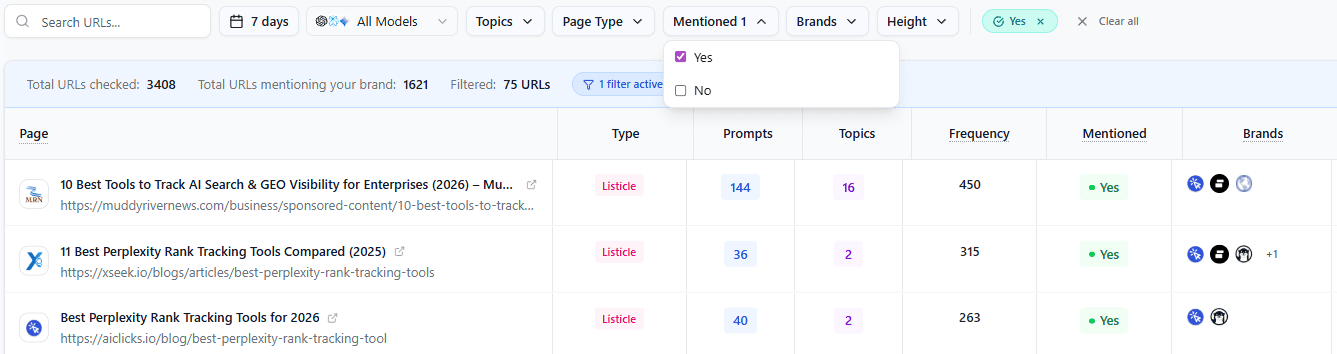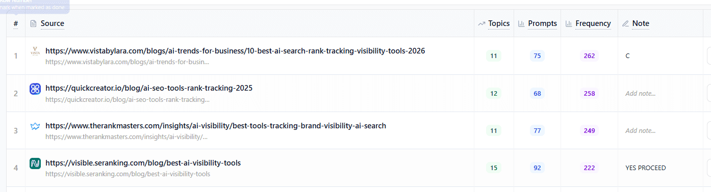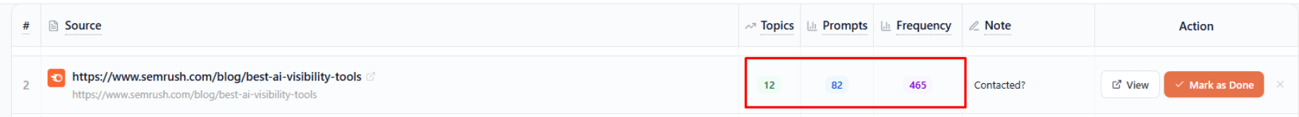 Prompt triggers → See how many different prompts each source appears in, helping you spot high-leverage mentions.