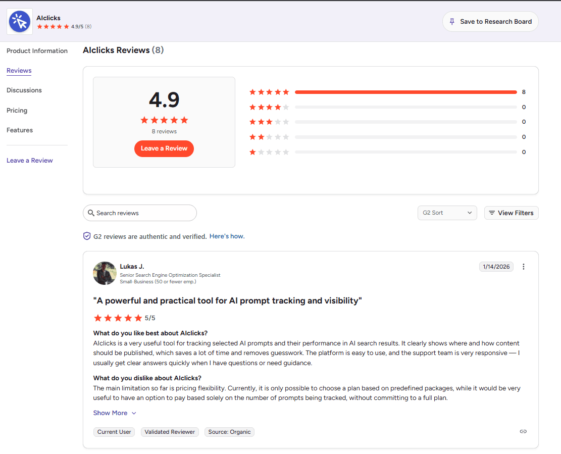 Review platforms are often part of the retrieval set for “best” and comparison queries. Ratings, recency, and feature-level feedback influence how your brand is framed.