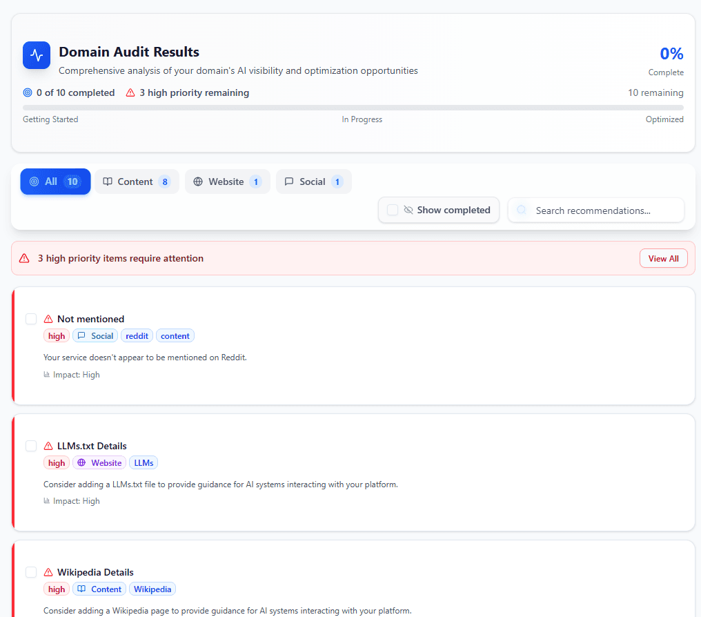 Actionable recommendations: Not just “track and forget” - you’ll get step-by-step suggestions (add LLMs.txt, create specific content, launch a Wikipedia page, etc.).