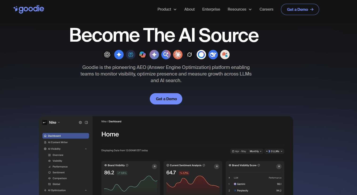 Goodie is ideal for brands seeking a full cycle AEO workflow, from detection to action and outcome measurement, especially those focused on both informational visibility and commercial performance inside AI systems.