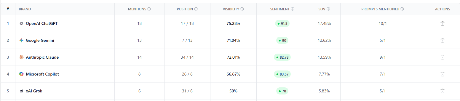Prompt-Level Tracking and Dashboards: You want to watch which questions get your brand mentioned, and how often, across multiple models.