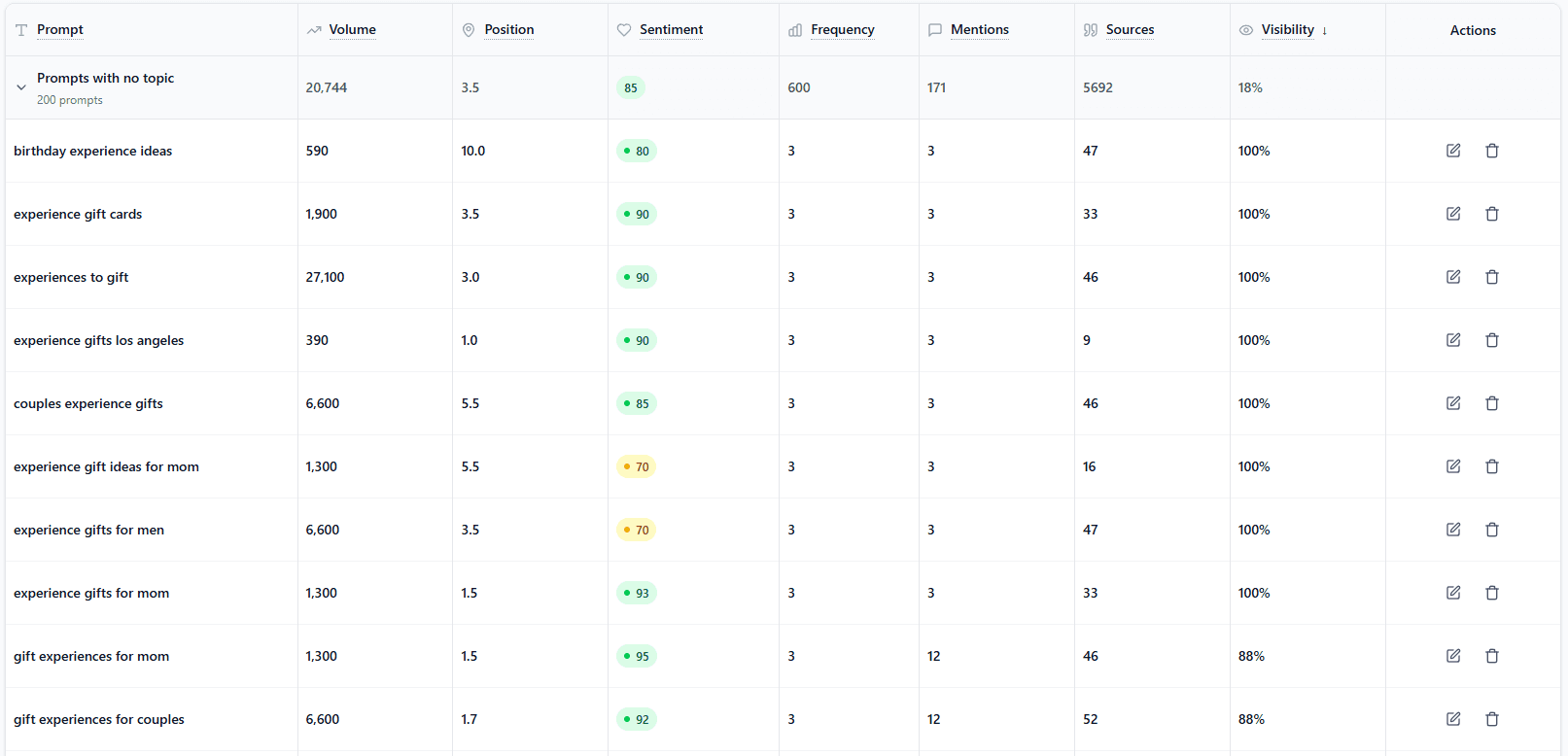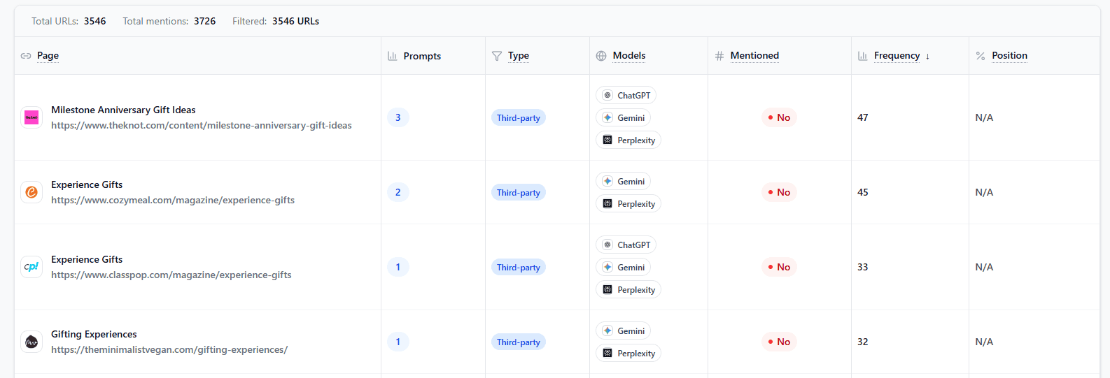 Find gaps: Identify prompts, engines, or source types (reviews, listicles, forums) where you’re missing or weak.