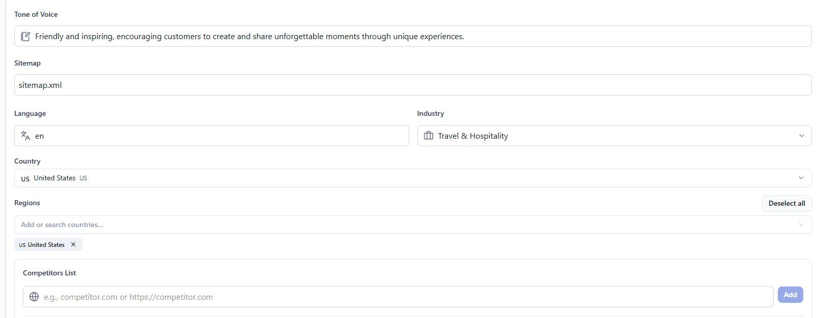 Brand configuration: Customize prompt sets, tone, and market focus so outputs align with your identity.