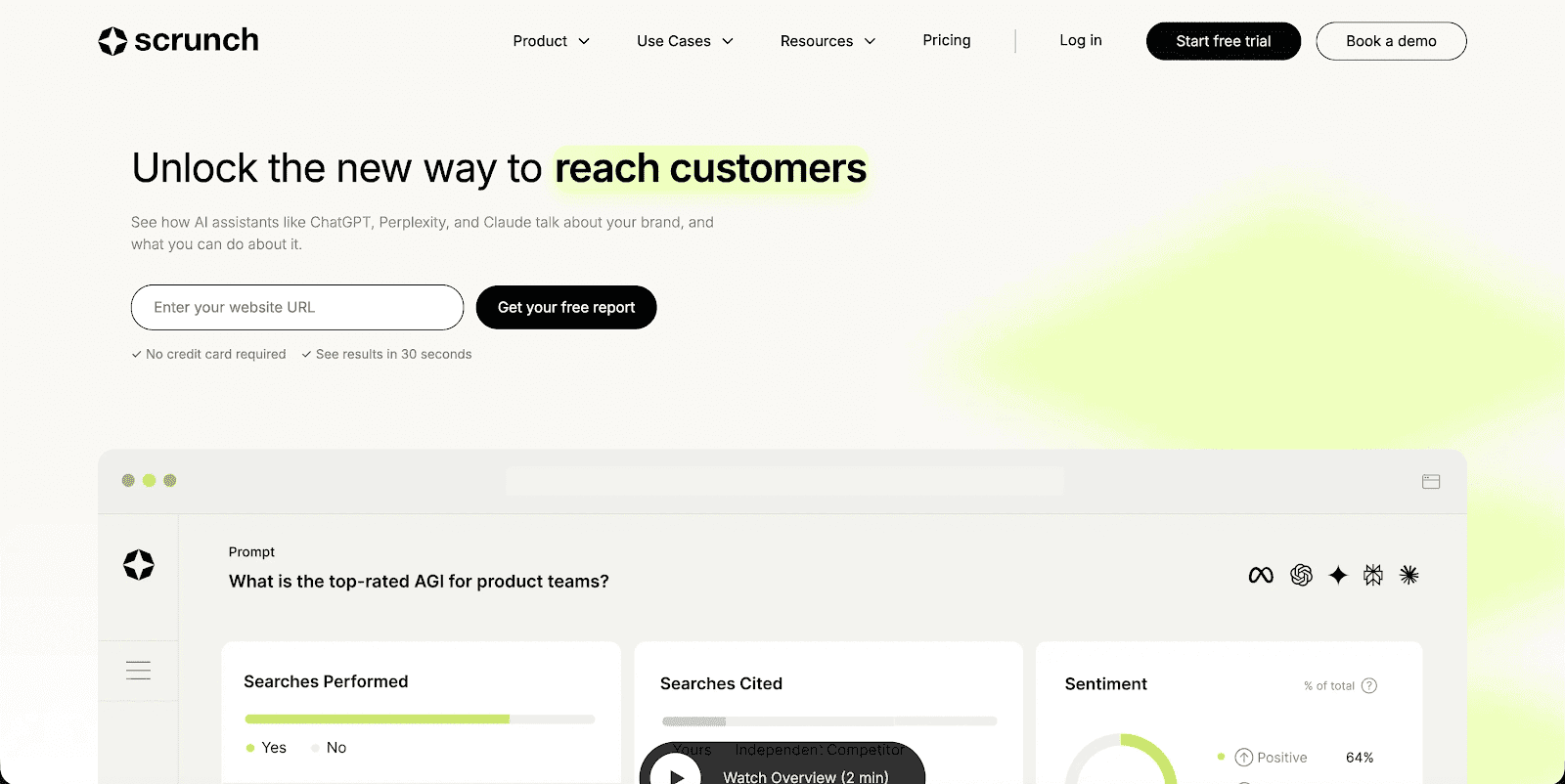 Includes sentiment monitoring and share-of-voice reporting across AI answers.