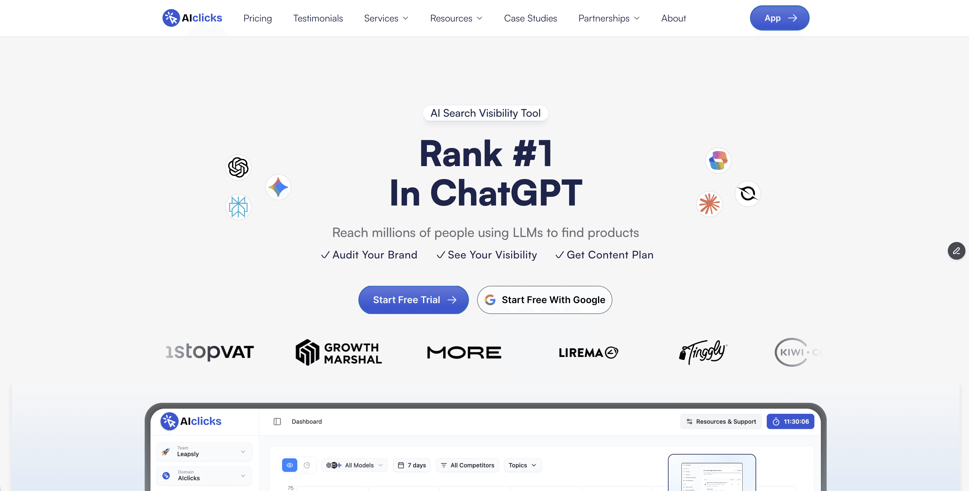 AIclicks is well-suited for brands and agencies that want a dedicated ChatGPT rank tracker with actionable insights. It works particularly well for teams that want to connect visibility monitoring with optimization actions and traffic attribution.
