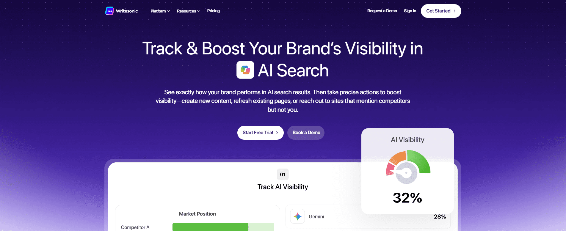 Use case: Ideal for SaaS or e-commerce teams needing continuous content refreshes. Writesonic spots where competitors are being cited in AI, then helps you fill those gaps with optimized assets.