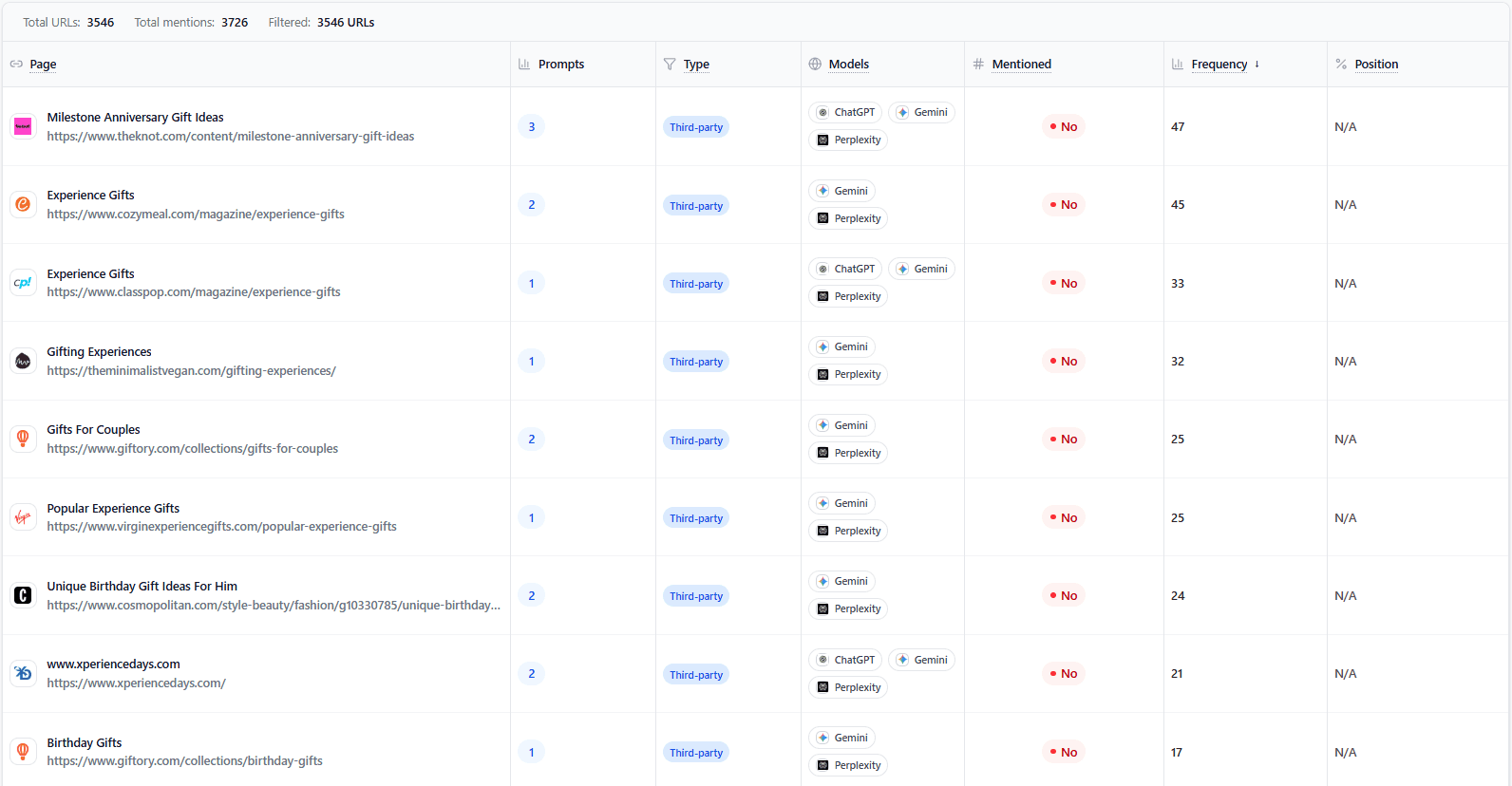 Use case: E-commerce brands can see if their products are being recommended by AI assistants, and which competitor products are winning. That informs outreach, PR, and content strategy.