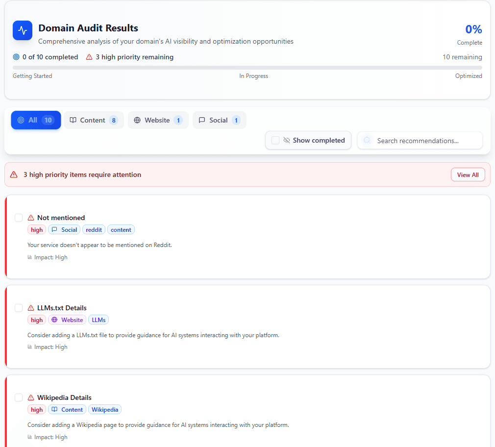 This is the tool we've founded to solve a problem most platforms ignore: not only making sure your brand appears in AI-generated answers, but also delivering the RIGHT actions to take to make increase your chances in being visible in AI.