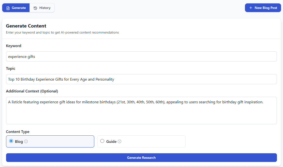 Use case: A small business or blogger can research a topic, generate a structured brief, and create an AI-drafted post, all in one workflow. Perfect for affordable, fast publishing.
