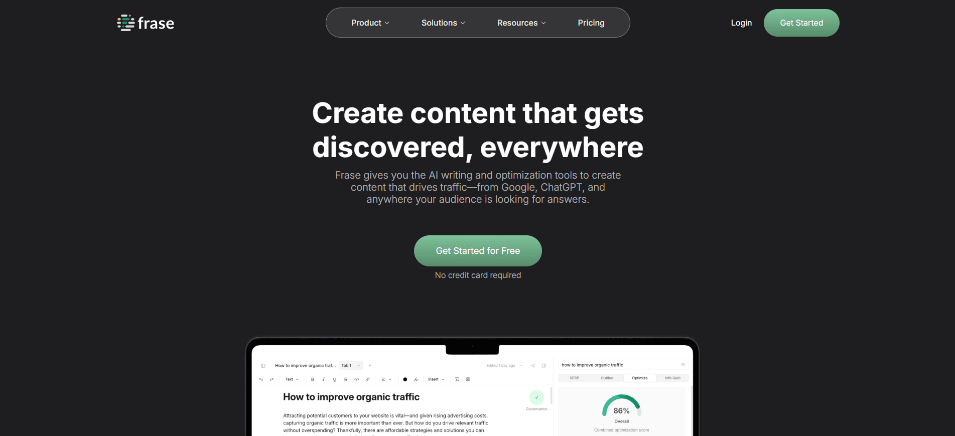 Frase is all about content workflows on a budget. It turns SERP insights into briefs, drafts, and optimized posts. NLP analysis ensures you cover topics and references that AI engines like to cite.
