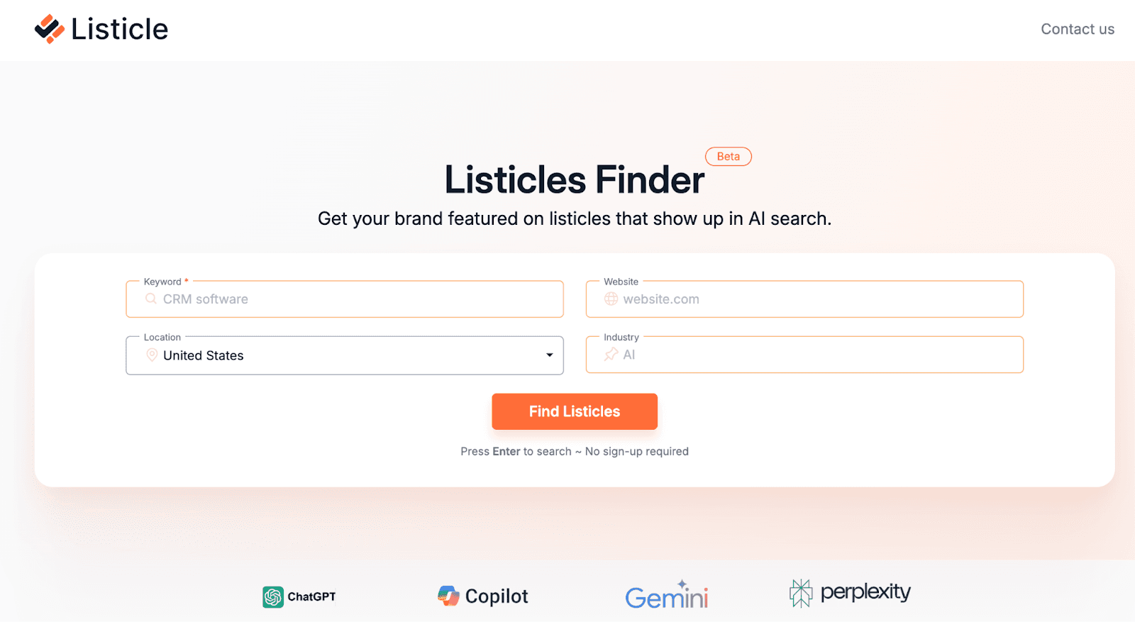 Listicle.com is a focused AI-based marketing tool that identifies “best,” “top,” and comparison-style listicle articles where brands already earn mentions and citations.