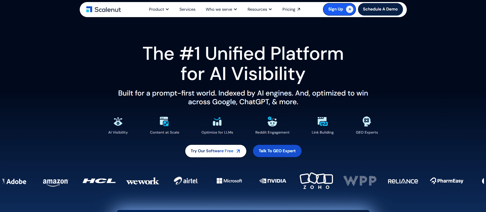 Scalenut positions itself as a full GEO platform. Its Cruise Mode writes AI-friendly blogs in minutes, while its GEO Watchtower tracks your visibility across AI engines. It also offers keyword clustering, audits, and link building marketplace tools.