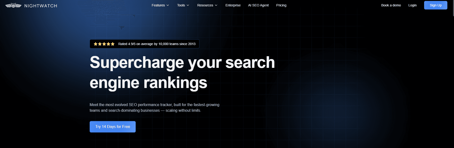 Nightwatch is a precision rank tracker. It supports classic engines (Google, Bing, YouTube) but also monitors visibility in ChatGPT, Claude, and Gemini. It can track down to the zip-code level and detect appearances in AI Overviews, featured snippets, and local packs.