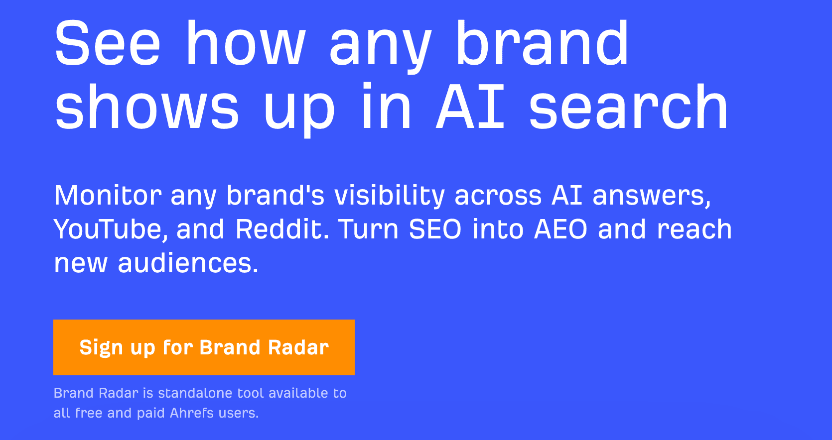 Ahrefs Brand Radar | Traditional SEO teams adding AI visibility | Google SERPs + AI Overviews | AI brand mention tracking, share-of-voice metrics | Backed by Ahrefs’ massive backlink & keyword database | Keyword-centric; lacks prompt-level tracking and centralized sentiment analysis | From $129/mo + $199/mo AI add-on |