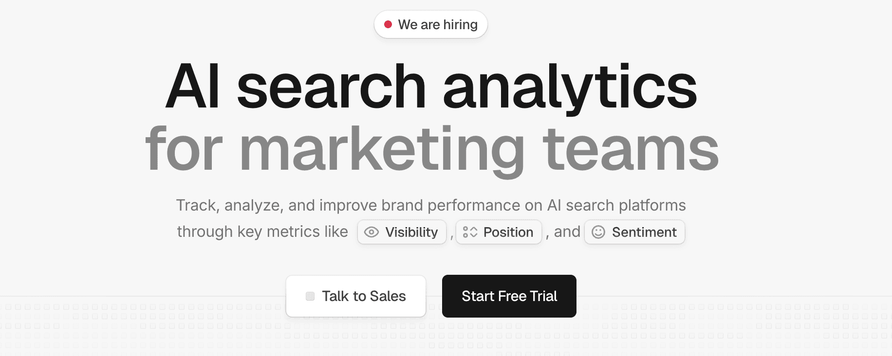 Peec AI is a solid choice if you want straightforward AI visibility tracking with competitor benchmarking and a user-friendly interface that marketing teams adopt quickly. The positioning is clear: track brand performance across ChatGPT, Perplexity, Claude, and Gemini, then use those insights to improve AI search presence.