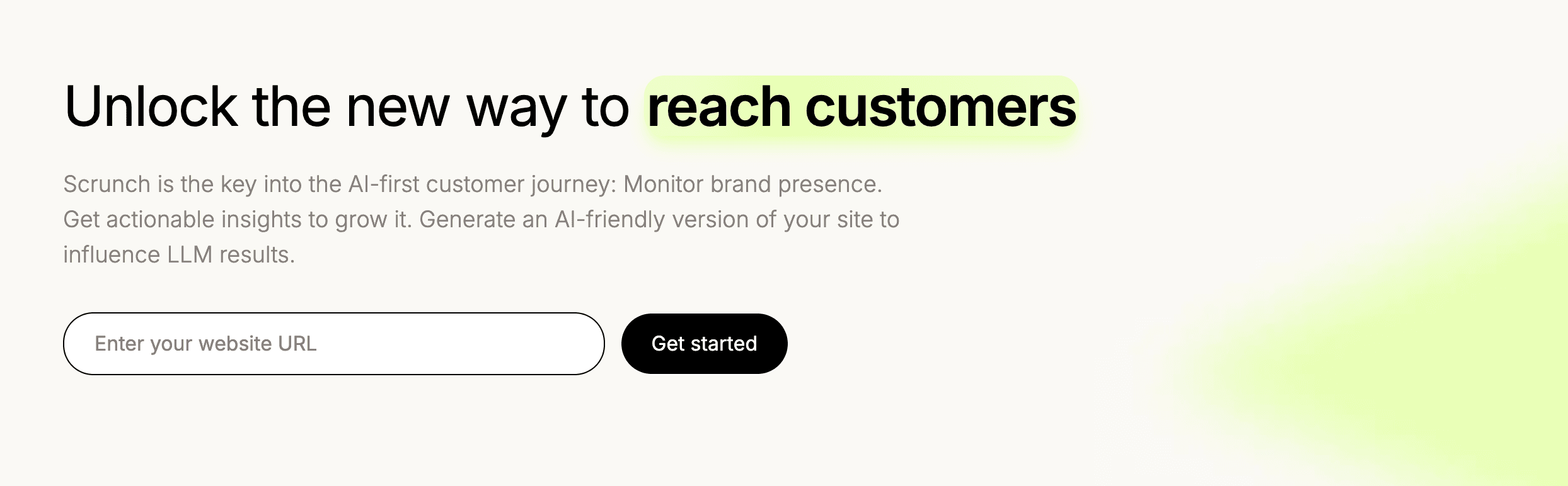 Scrunch is built specifically for AI search and agent ecosystems, not classic SERPs. It includes prompt monitoring, citation tracking, and page audits, plus “agent traffic monitoring” to help attribute AI-driven visits.