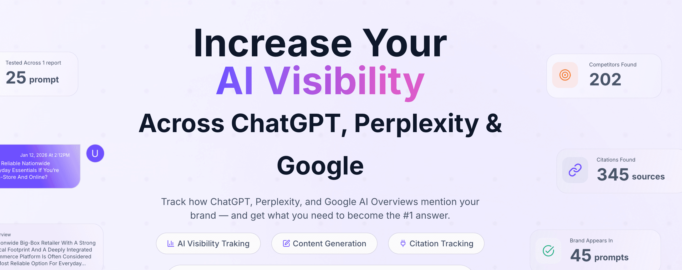 Rank Prompt is positioned as an “AI search presence” platform that combines monitoring with content generation and basic SEO audits. It is closer to an all-in-one SEO toolkit for teams that want to execute within one product.