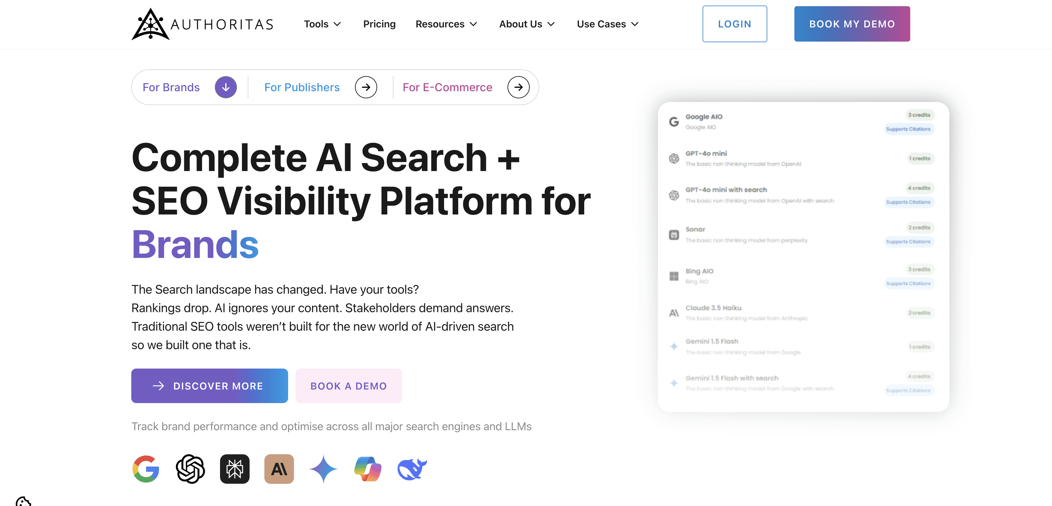 Authoritas | Brands and agencies needing customizable AI visibility tracking across markets and query types | ChatGPT, Gemini, Perplexity, Claude, DeepSeek, Google Al Overviews and Bing Al | AI search monitoring, custom prompt universe, query tracking, sentiment analysis, multi-language & multi-market monitoring | Highly customizable prompt sets and visibility tracking, multi-market and multi-model monitoring, built for structured AI brand insights | More configuration required compared to lightweight trackers; not positioned as an “entry” budget tool | Custom pricing |