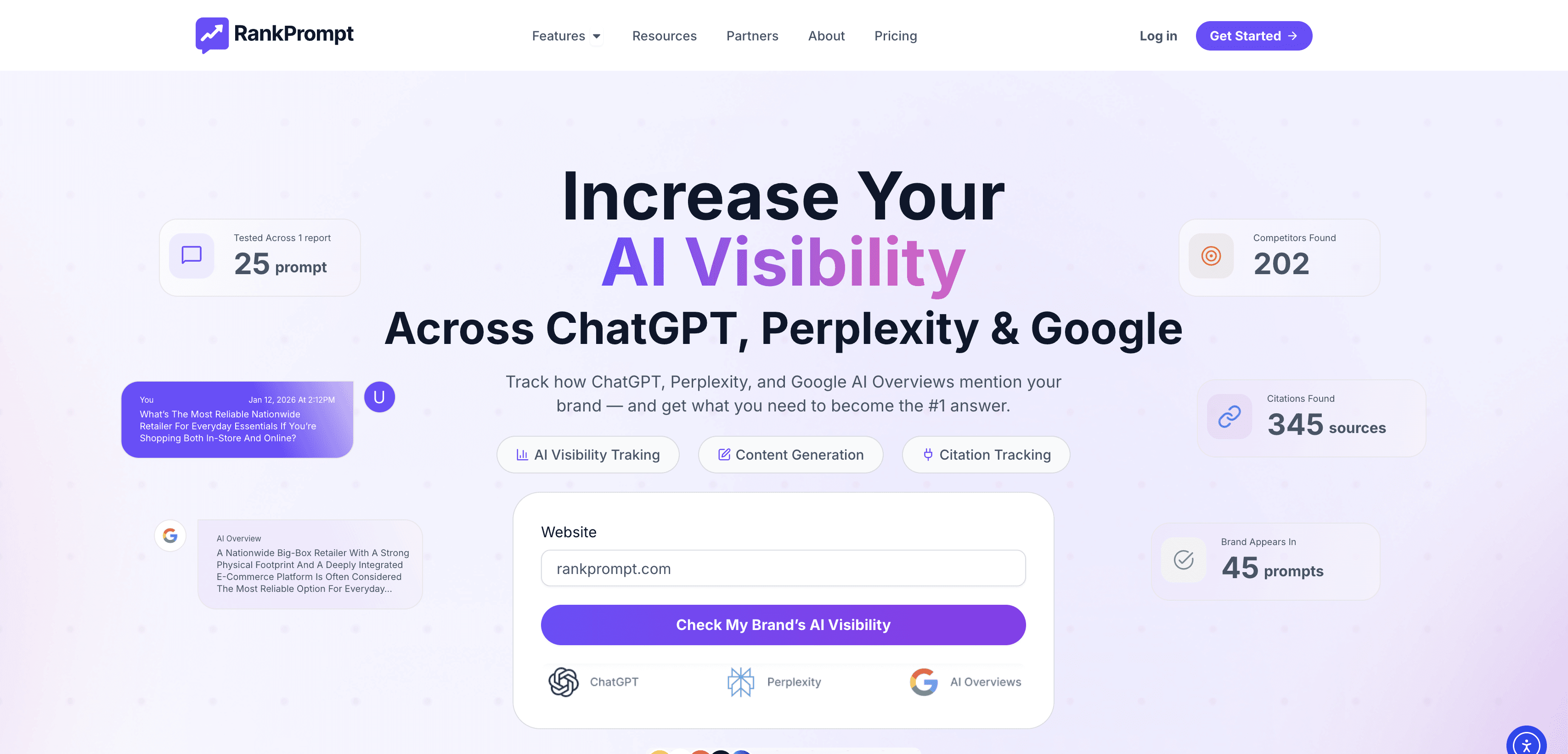Rank Prompt is positioned as an AI search presence platform that combines prompt tracking with content generation and reporting. Instead of just showing where your brand appears in AI-generated answers, it allows teams to turn visibility gaps into publish-ready content inside the same workflow.