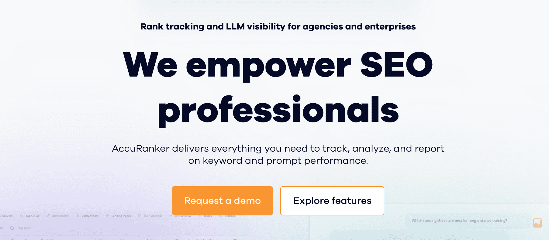 AccuRanker | Fast, real-time rank updates | Google & Bing SERPs, limited AI (AccuLLM) | On-demand ranking updates, Share of Voice, API access | Fastest rank refresh speeds available | Expensive for its scope, primarily SERP-focused, limited AI ecosystem view | From $129/mo |