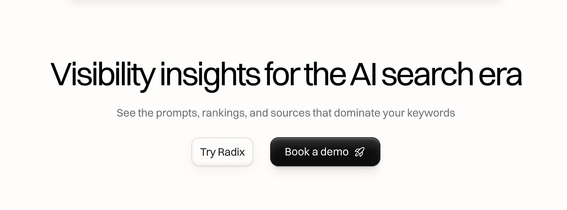 Radix AI | Budget AI visibility tracking | ChatGPT, Perplexity (more on Enterprise) | Prompt research assistant, daily tracking, GSC integration | Very affordable and simple setup | Limited engines & multi-brand support on lower tiers | $49/mo (Starter); $169/mo (Pro) |