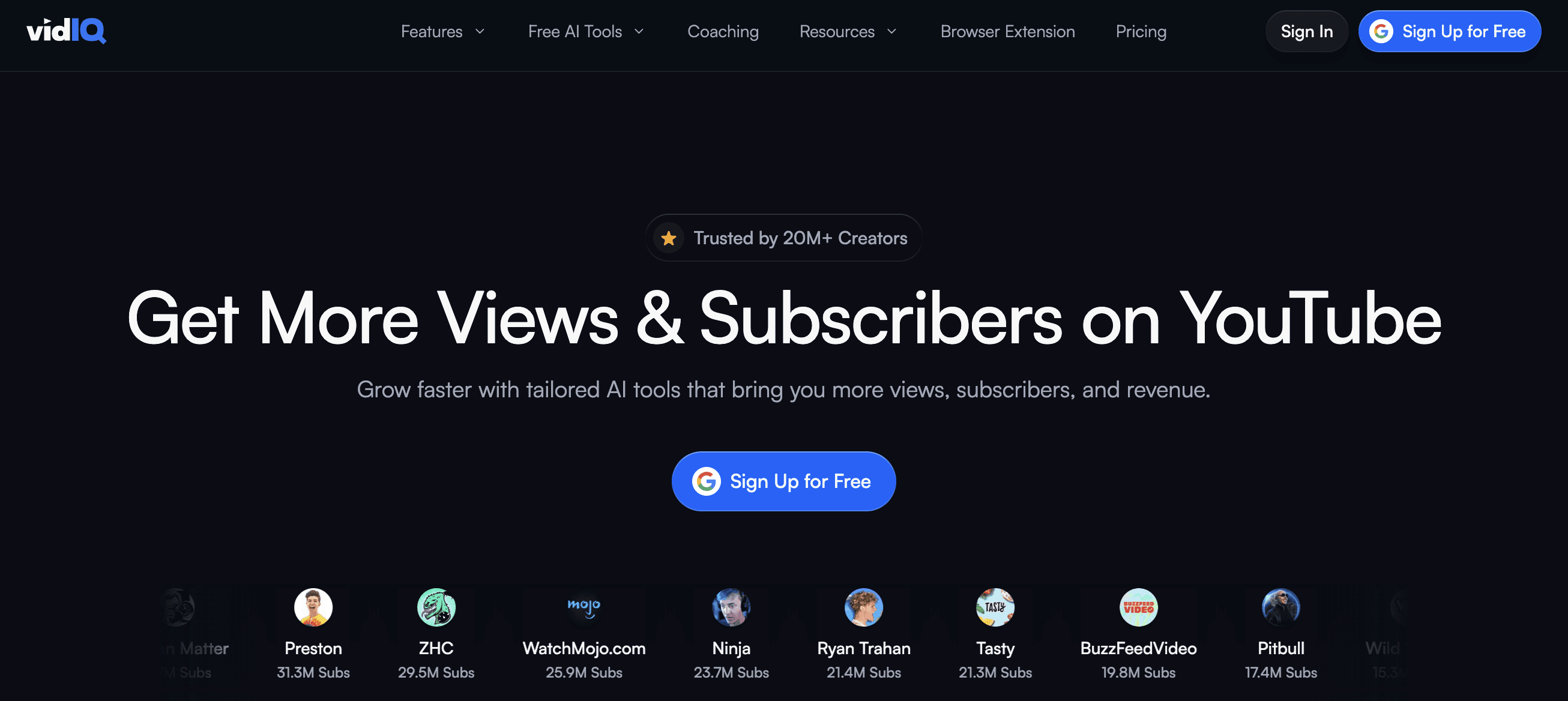 Strengths: Excellent for AI-era topic discovery, source analysis, and visibility research. Strong fit for brands that want YouTube content to support search, AI visibility, and thought leadership.