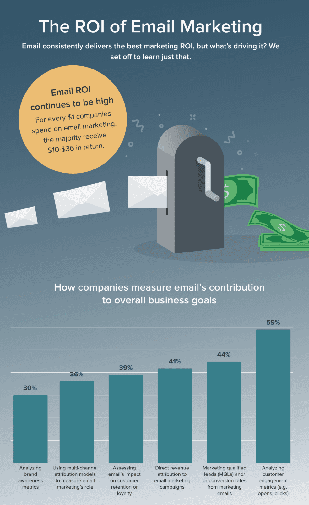 Litmus reports that many companies see $10–$36 ROI per $1 spent on email.