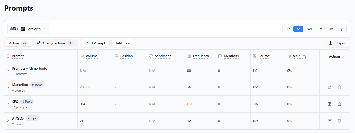 Use prompt analysis to guide your cluster building (see our guide on which prompts to track on ChatGPT and Perplexity for detailed insights). At AIclicks, I run weekly audits to see which topics have low penetration, then create supporting posts or comparison tables to strengthen our content “family.”
