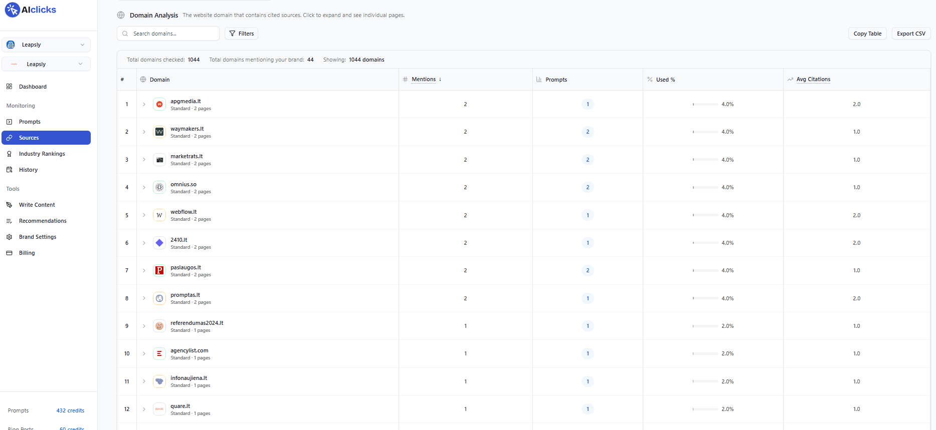 Track which external domains Perplexity currently references and monitor your citation share. At AIclicks, we shape our outreach based on which sources get cited most often.