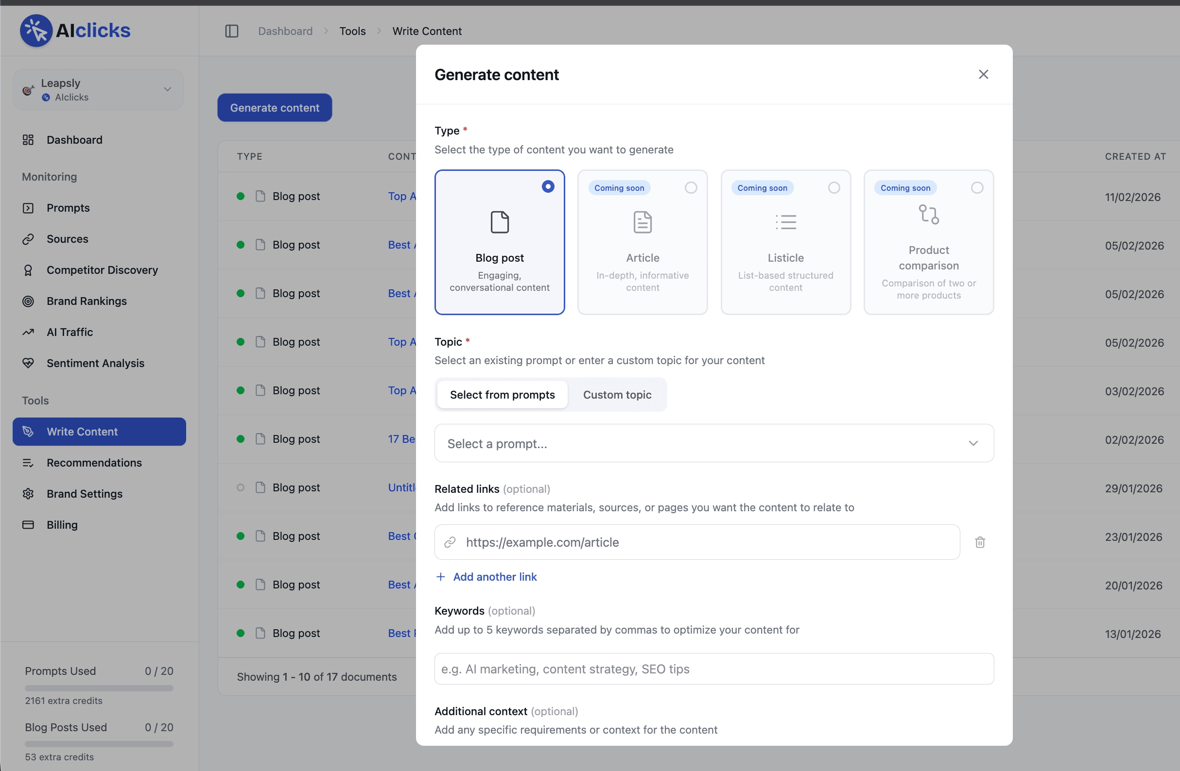 We launched more than 30 blog posts simply from analyzing the topic patterns of different sources being cited by LLMs. Each one was built around a specific prompt cluster or source pattern we identified through AIclicks data.