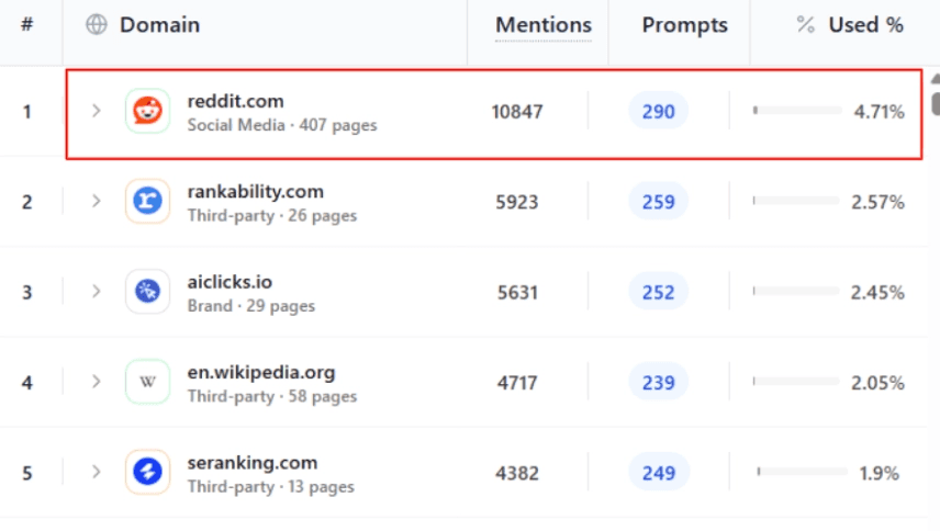 Reddit is the single most frequently cited website by LLMs. In our tracking data, reddit.com sits at #1 with over 10,800 mentions across 290 prompts and 407 individual pages being referenced. That makes it more cited than Wikipedia, more cited than any individual brand's website, and more cited than any other social platform.